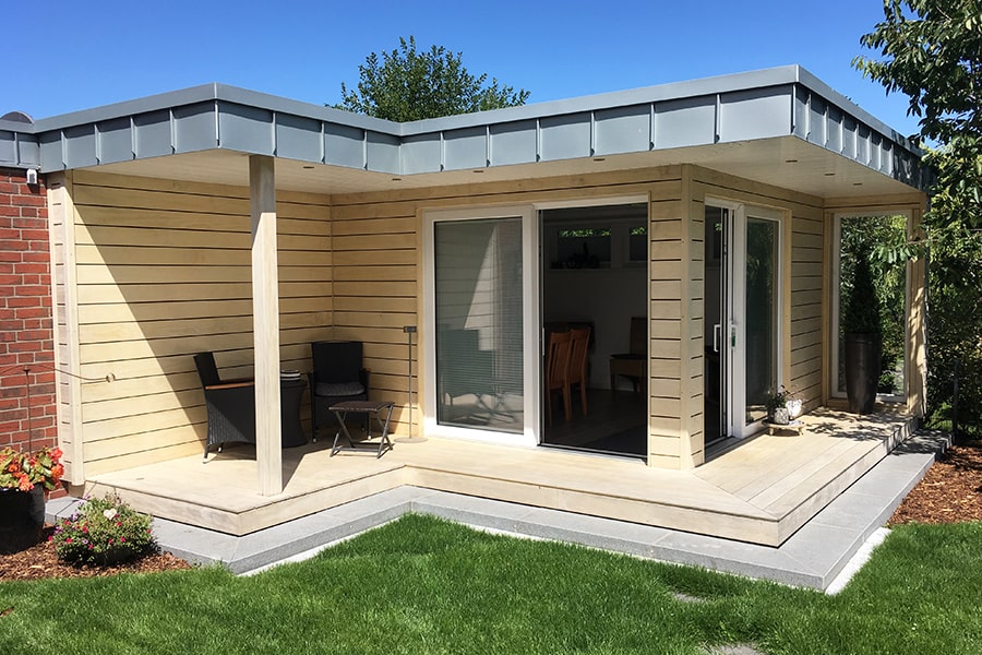 Wir planen Ihr Gartenhaus individuell – ob Pavillon, Flachdachhaus, klassisches Satteldach oder moderne Architektur mit großen Glasflächen.